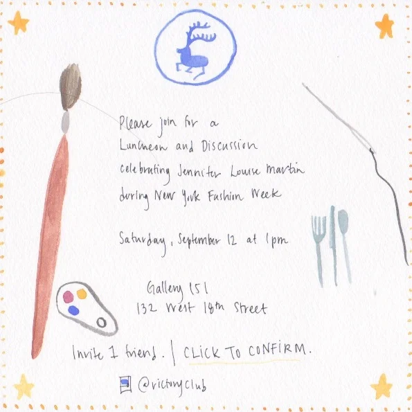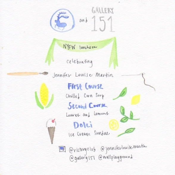 Gallery 151 is hosting Victory Club for a luncheon and celebration of Jennifer Louise Martin during New York Fashion Week. The menu follows below and is inspired by the work that will be on display.