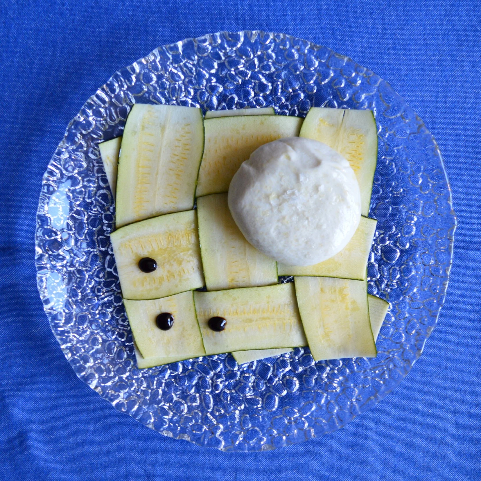 - Lay the zucchini slices flat on a plate, weaving the zucchini into a basket weave pattern.