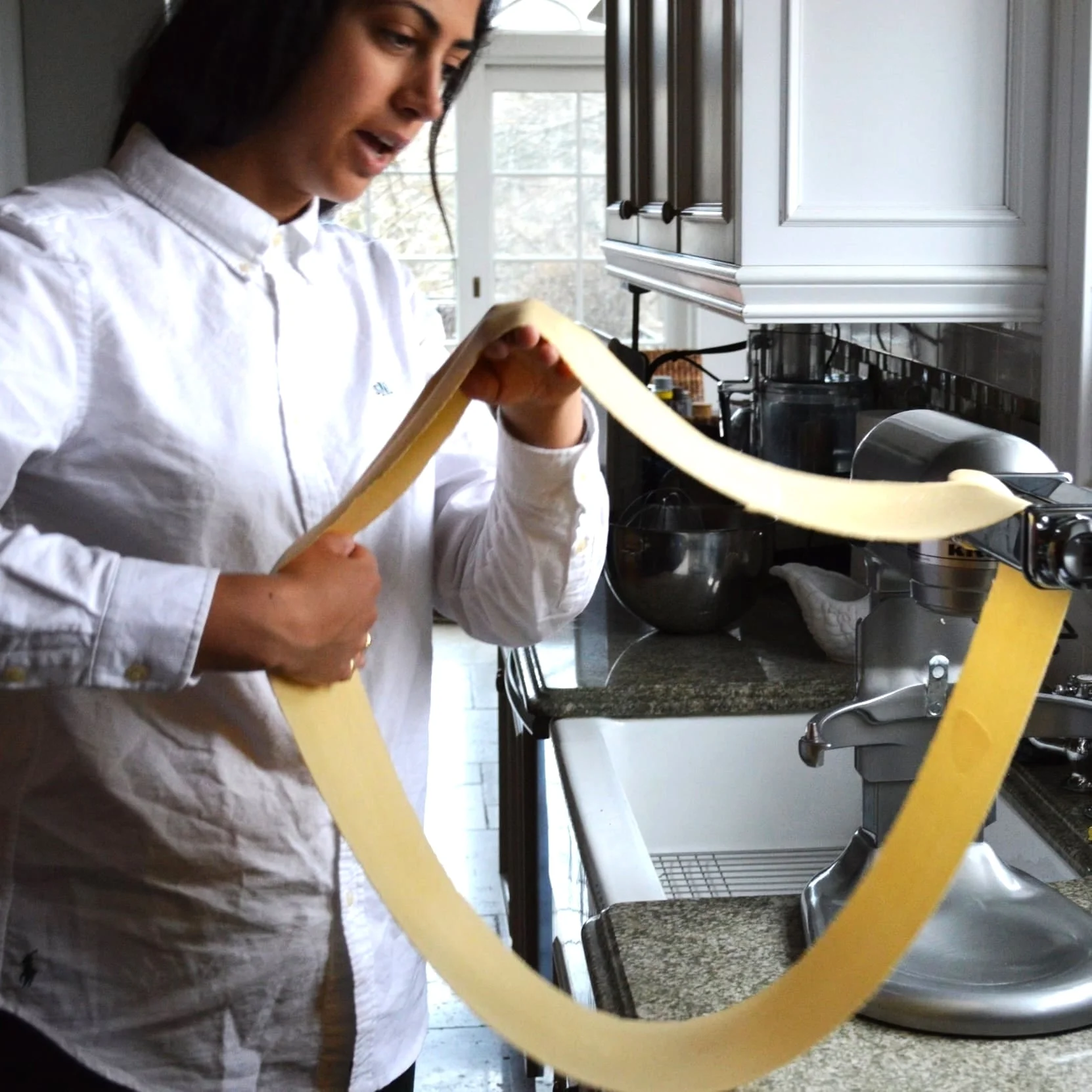 The process of making pasta is facilitated by KitchenAid's attachments. The attachments make the pasta sheets (and ultimately strands) much more uniform. Not only is this uniformity more beautiful, but also it ensures a more even cook time for all of the pasta.