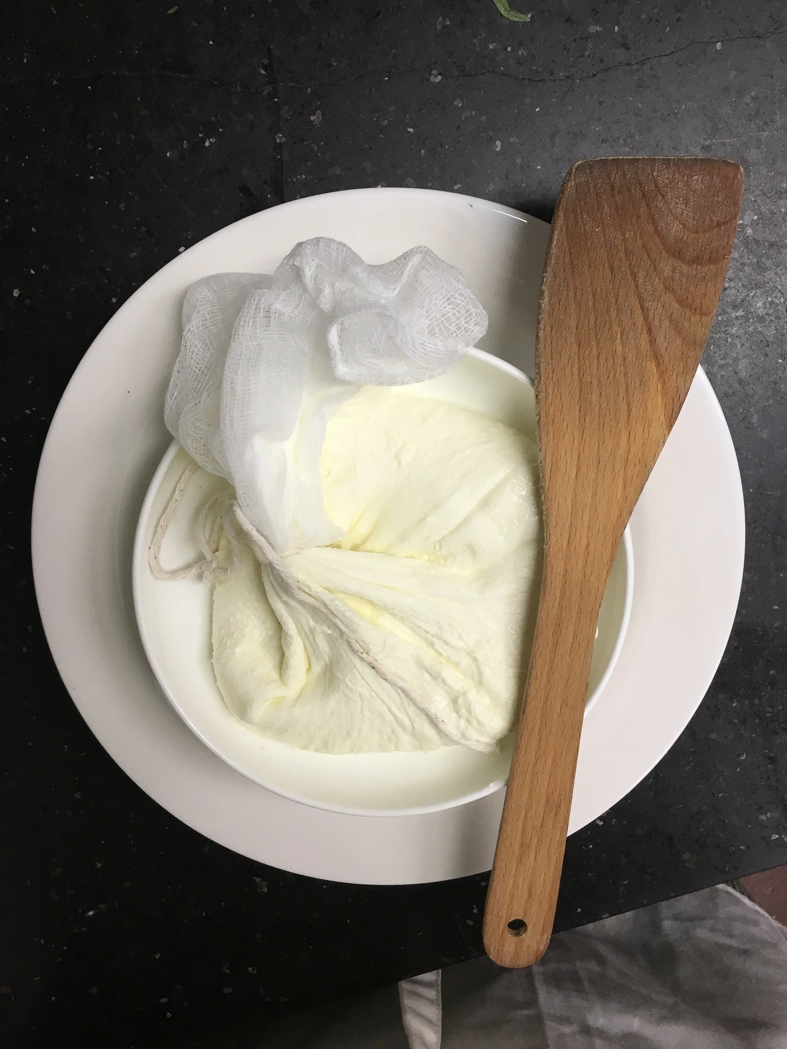 - Line a strainer with damp cheesecloth. Carefully pour the mixture over the cheesecloth, gather up the ends and tie them, letting the curds form into a ball.