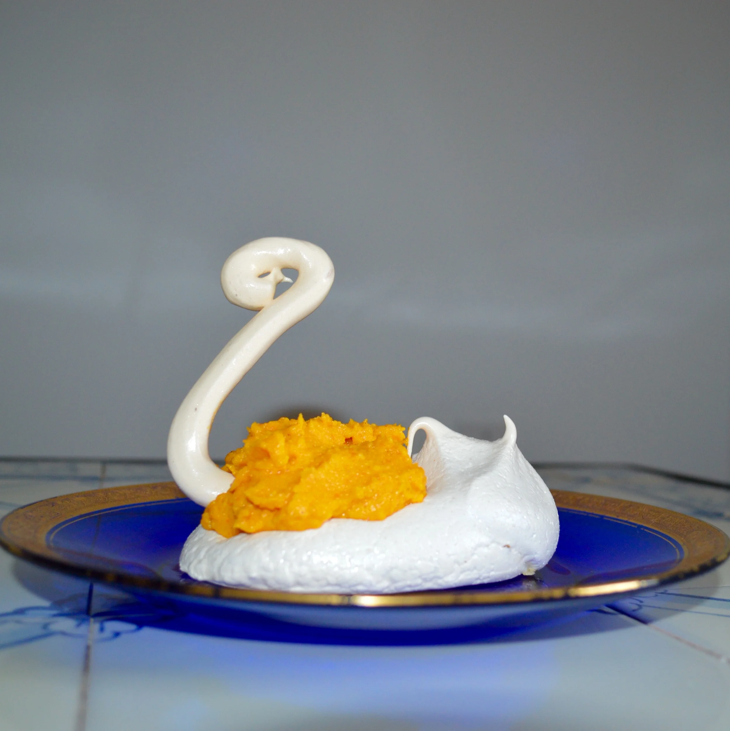 My advice on this is to make extra swan bodies and necks, as the meringue cracks easily. Also, wait to plate these until dessert, as plating too early will result in the meringues dissolving in the wet carrot purée.