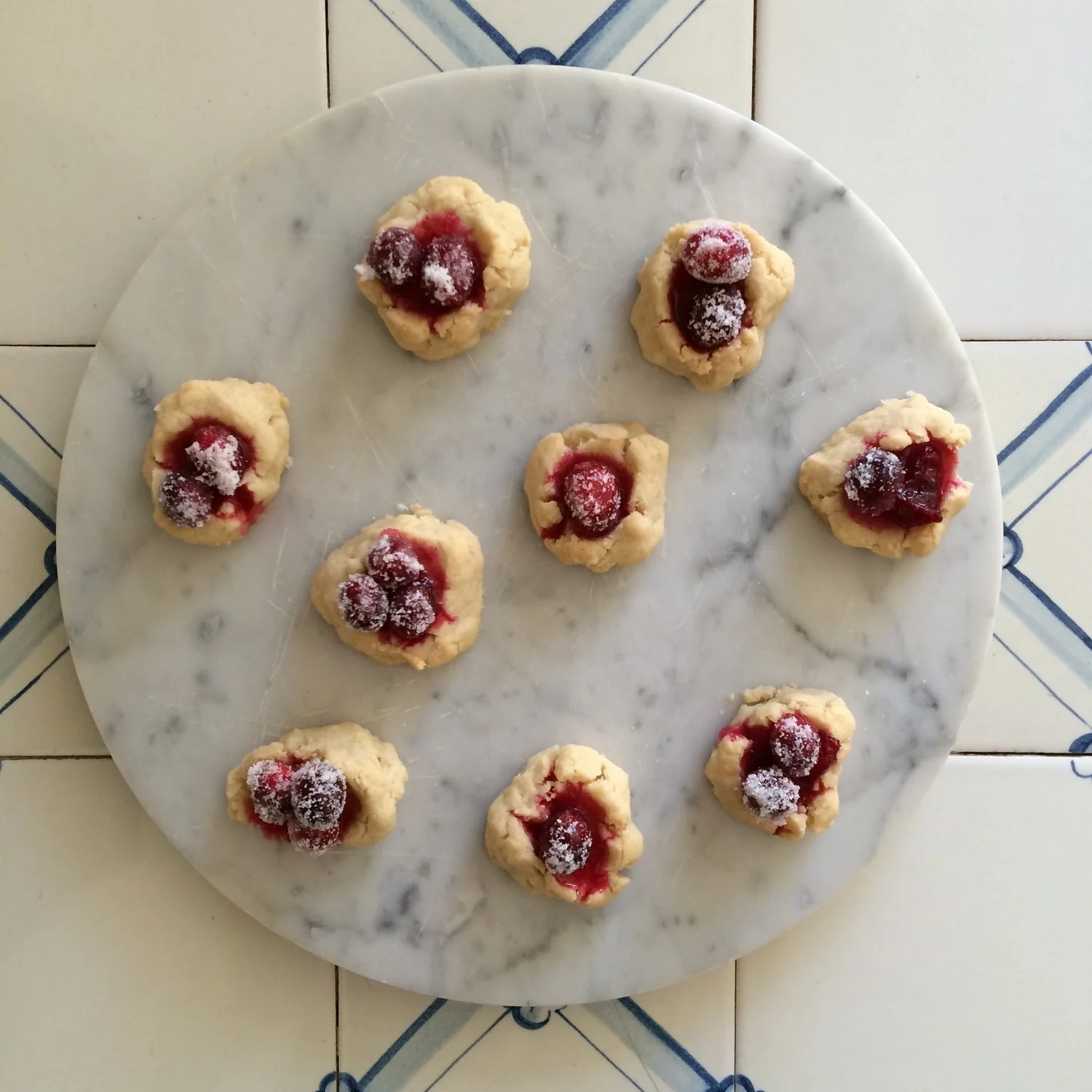 I filled the thumbprints with my apple cider cranberry sauce. For added aesthetic effect, I topped them with sugared cranberries from Sally's Baking Addiction recipe.