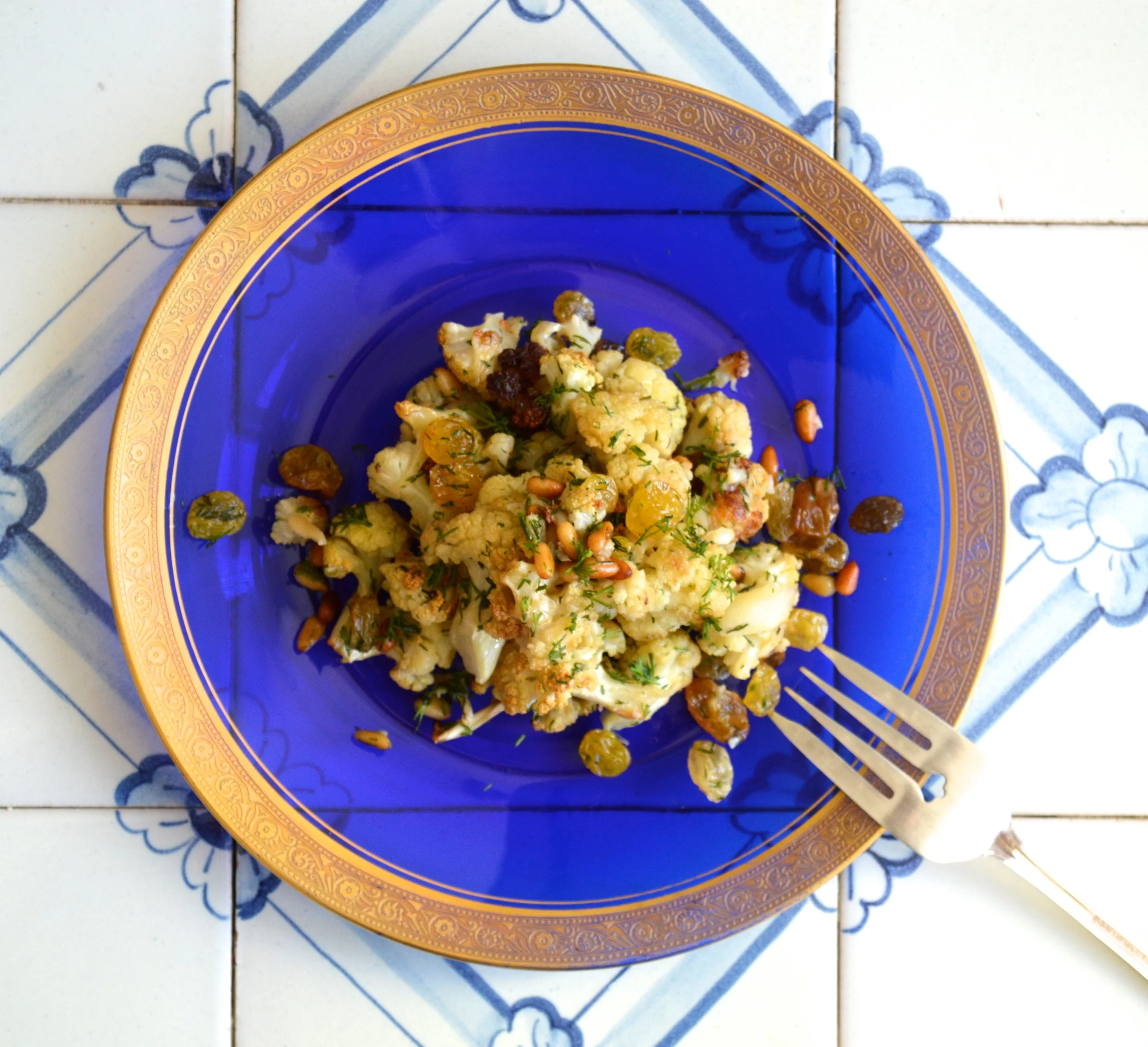 - When cauliflower and pine nuts are nicely roasted, toss into a bowl with the raisins and dill